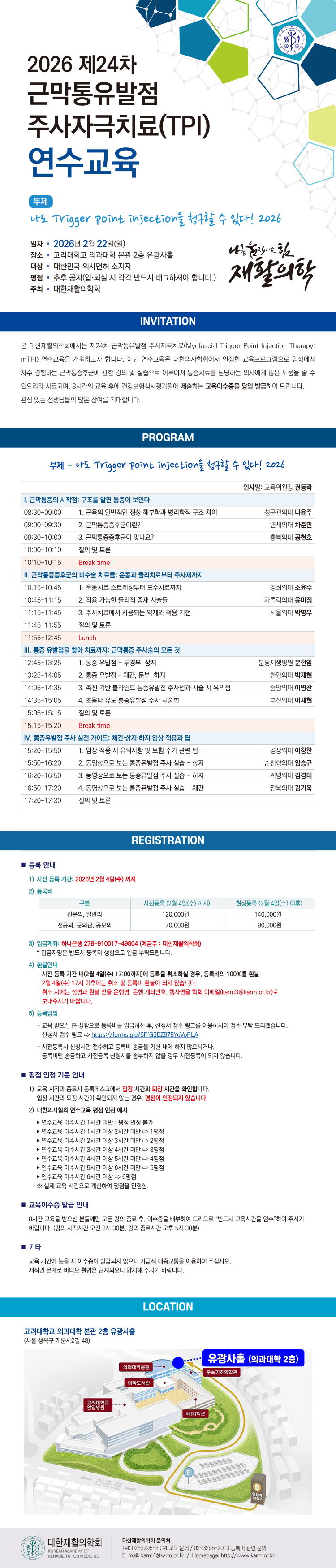 | 대한재활의학회 제24차 근막통유발점 주사자극치료(TPI) 연수교육 안내 | |||||